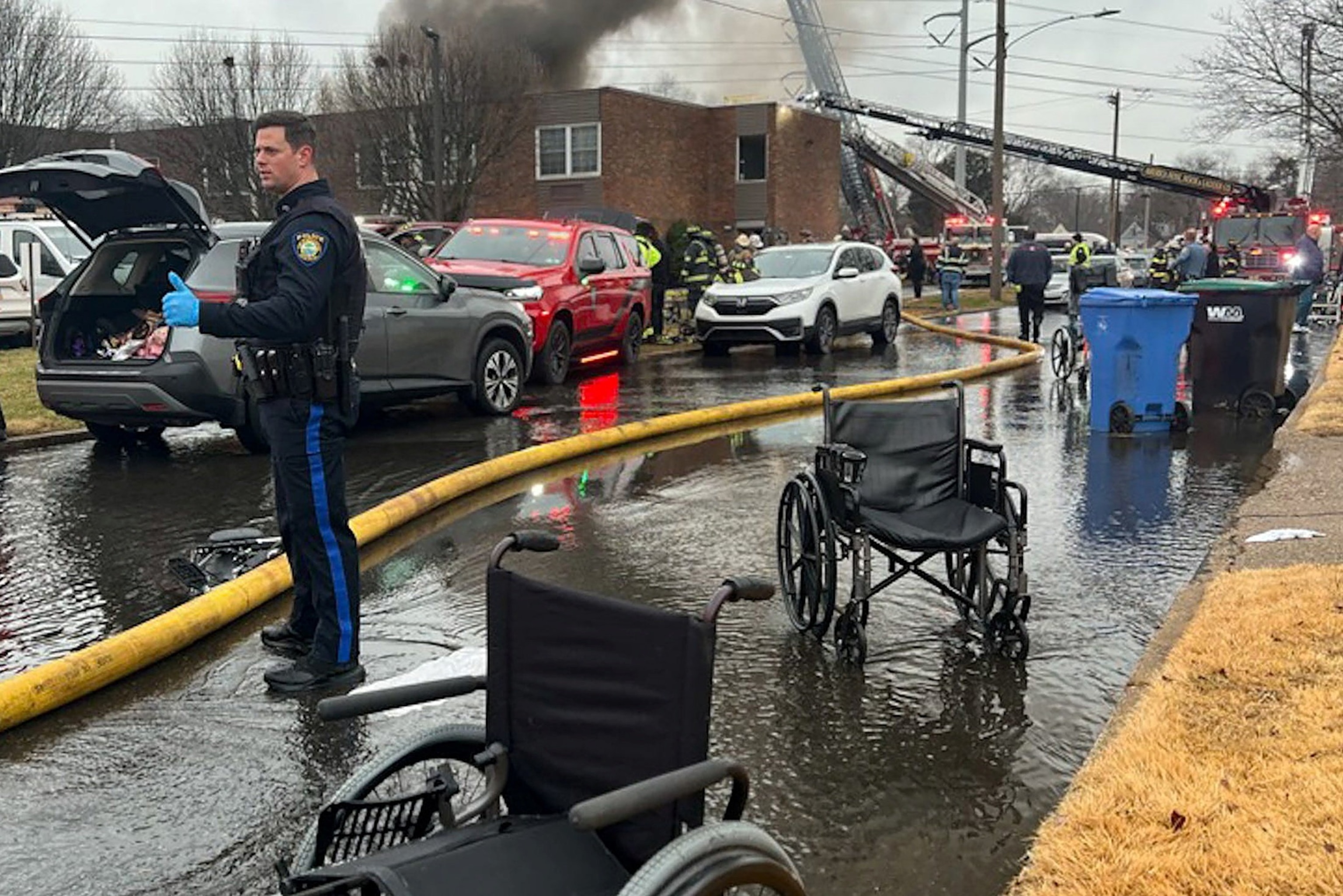 Seorang petugas polisi menjaga jalan tetap bersih bagi petugas pertolongan pertama setelah ledakan gas dan kebakaran menyebabkan kerusakan besar pada panti jompo Silver Lake Health care Center di Bristol, Pa., 23 Desember 2025