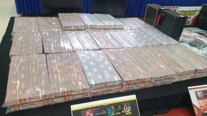 Tumpukan uang hasil sitaan dari jaringan judi online