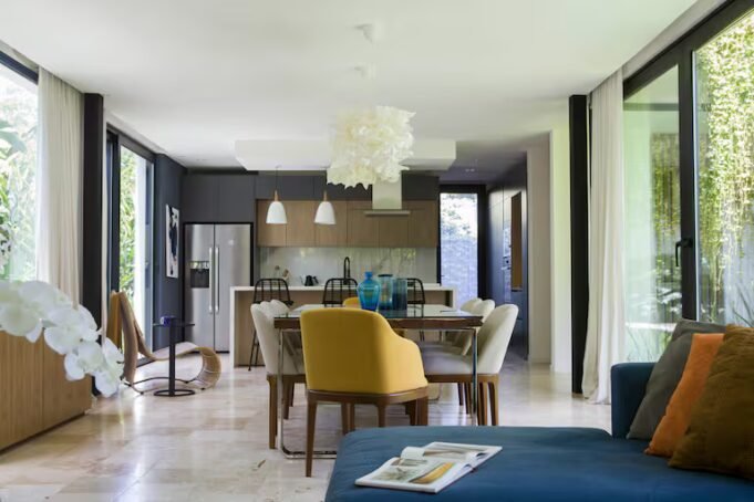 Dekorasi dan desain interiornya dirancang oleh Patricia Pelliccioni, pemilik rumah, yang memilih dan menghargai setiap perabot dan penutup sementara pekerjaan berlanjut, untuk memastikan bahwa dia memiliki semua yang dia butuhkan dan tidak bergantung pada ketersediaan di masa depan. Ruang makan terintegrasi dengan dapur, desain minimalis dipercantik dengan detail: kursi bernuansa netral dan mustard, meja kaca, dan lampu pahatan yang menambah kepribadian pada ruangan.