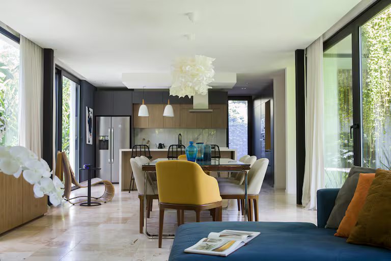 Seluruh lantai dasar disatukan dengan lantai travertine (Decoporcelanatos), menciptakan kesinambungan dan harmoni dalam ruang. Lampu di pulau (Salazar Casa). Bangku hitam (Tengara). Perabotan dapur (Gaudir Johnson). Meja ‘Neolit’ (De Stefano).