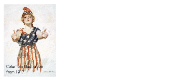 Simbol pertama yang memiliki makna seperti itu adalah Columbia, seorang tokoh wanita (namanya berasal dari Christopher Columbus) dan masih merupakan simbol negara kita yang sering digunakan hingga awal abad ke- 20 Columbia pertama kali muncul pada 1738 untuk merujuk pada tiga belas koloni yang menjadi AS, dan sering digambarkan dengan Girl Liberty. Nama ini digunakan di banyak kota di seluruh AS dan dipilih ketika ibukota dinobatkan sebagai Distrik Columbia pada tahun 1801