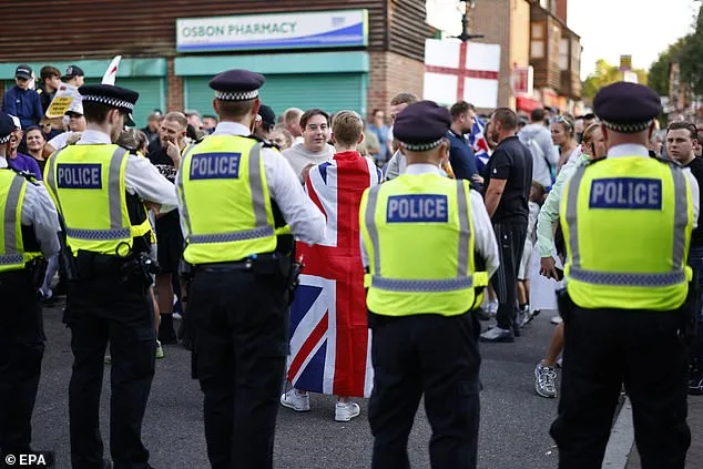 Polisi berdiri di depan para pemrotes di luar TLK Apartments & Hotel Housing Asylum Seargers di Orpington, Greater London