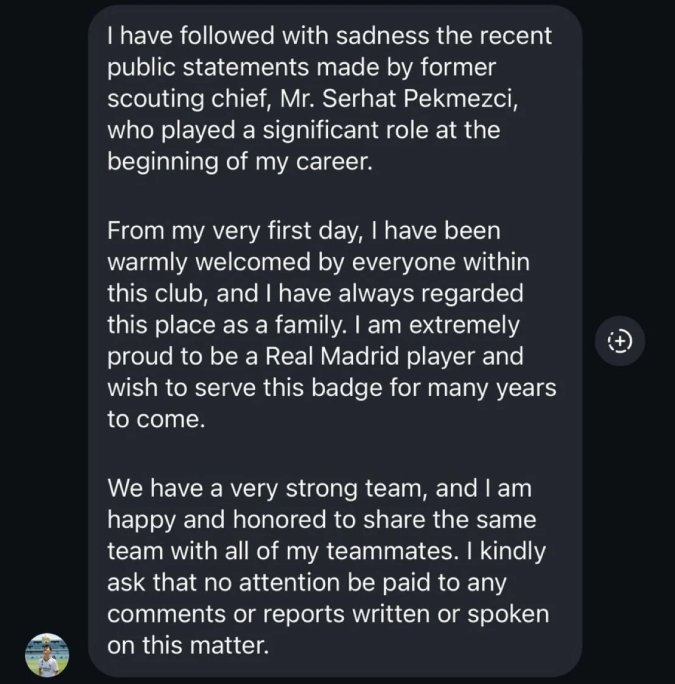 “Saya mengikuti dengan sedih pernyataan publik baru-baru ini yang dibuat oleh mantan kepala kepanduan, Tuan Serhat Pekmezci, yang memainkan peran penting di awal karir saya. Sejak hari pertama saya, saya telah diterima dengan sangat hangat oleh semua orang di klub ini, dan saya selalu menganggap tempat ini seperti sebuah keluarga. “Saya sangat bangga menjadi pemain Real Madrid dan saya ingin mempertahankan perisai ini selama bertahun-tahun lagi,” tulis Güler di akun Instagram resminya.