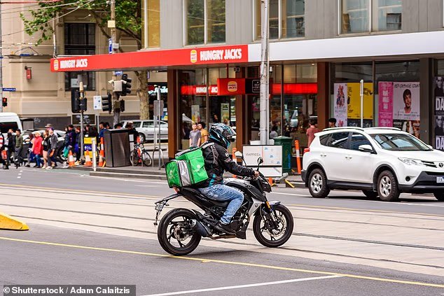 Pengendara e-bike Menulog melintasi jalan kota Melbourne, di atas