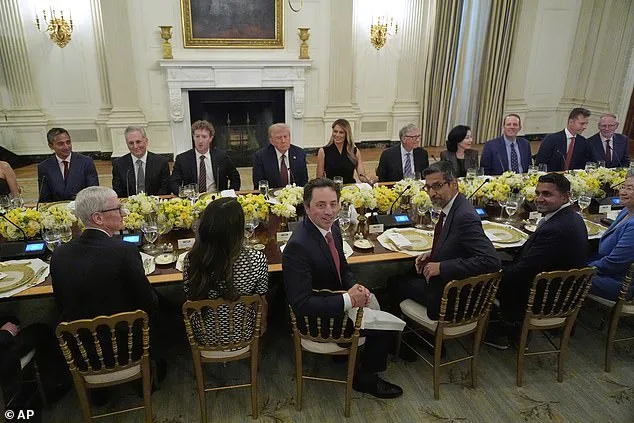 Presiden Donald Trump dan Ibu Negara Melania Trump mengadakan makan malam yang intim dengan para pemimpin teknologi Kamis malam di ruang makan negara bagian – setelah rencana untuk mengadakan pertemuan di taman mawar yang baru diulang dibatalkan karena hujan deras di Washington, DC