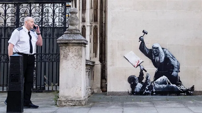 Artis jalanan Inggris Banksy telah melukis mural di Pengadilan Tinggi London yang menggambarkan seorang hakim mengalahkan seorang pemrotes, mungkin sebagai reaksi terhadap penangkapan ratusan demonstran yang mendukung kelompok aksi Palestina yang dilarang.