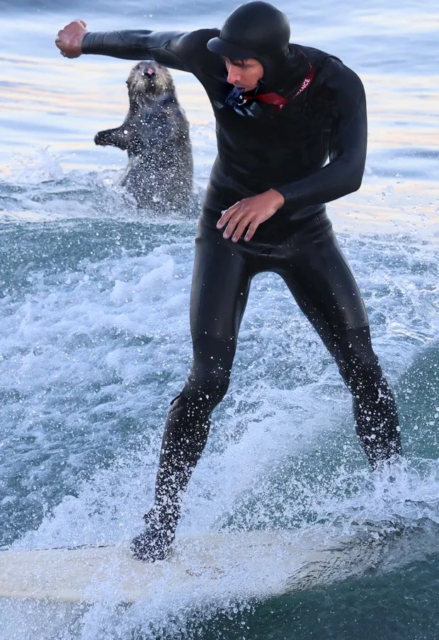 Mark Woodward, seorang fotografer lokal yang mengambil foto insiden hari Rabu tersebut, kembali ke tempat yang sama di atas Steamer Lane pada hari Kamis untuk melihat apakah interaksi aneh tersebut akan terus berlanjut. Nalurinya benar.