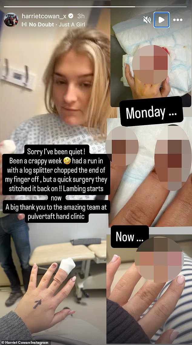 Harriet Cowan mengungkapkan dia dilarikan ke rumah sakit pada hari Senin setelah ujung jarinya terpotong dalam kecelakaan mengerikan yang memerlukan operasi darurat.