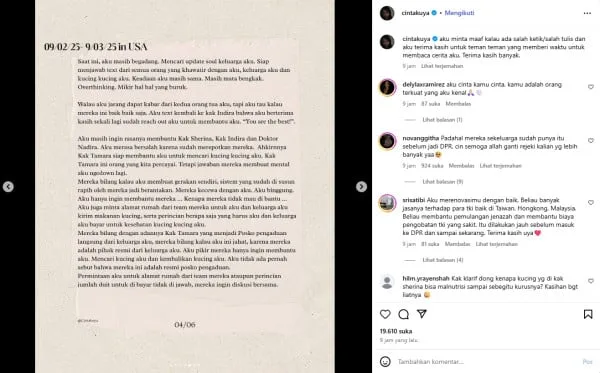 Dalam unggahan yang sama, putri sulung Uya Kuya itu mengaku sempat merasa bersalah karena merepotkan Sherina dan timnya yang sudah berusaha membantu proses penyelamatan kucing. Ia kemudian menghubungi Tamara, sosok yang dipercaya keluarganya, untuk ikut turun tangan mencari hewan peliharaan tersebut.