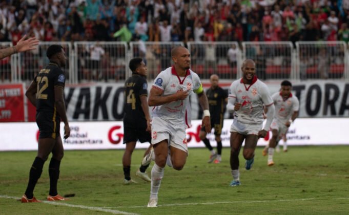 Selebrasi Gustavo Franca seusai mencetak gol penentu kemenangan Malut United menghadapi Borneo FC di Stadion Gelora Kie Raha, Ternate, Minggu (28/12). Foto: Dokumentasi Malut United