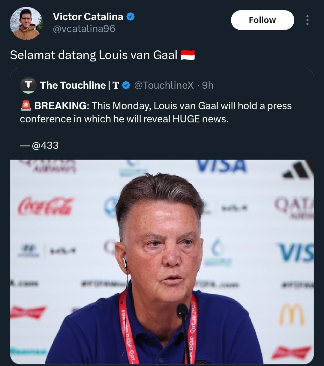Bersamaan dengan itu, isu merapatnya Louis van Gaal ke Timnas Indonesia tengah jadi perbincangan hangat di kalangan pencinta sepakbola Tanah Air.