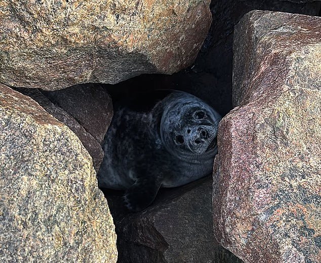 Juru bicara BDMLR setempat mengatakan: ‘Saat tiba, anjing laut itu ditemukan terjepit di antara batu-batu besar, jauh di dalam lapisan baja dan hanya dalam jangkauan.