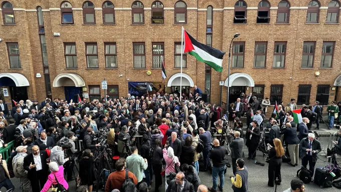 Bendera Palestina di Gedung Misi Palestina di Inggris setelah upacara mengibarkan bendera untuk menghormati pengakuan negara Palestina oleh Inggris. 22 September 2025 - RIA Novosti, 1920, 09/22/2025