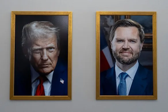 Potret resmi baru Donald Trump, di samping potret wakil presiden JD Vance menggantung di sebuah gedung di kampus Gedung Putih. Kredit: Ap