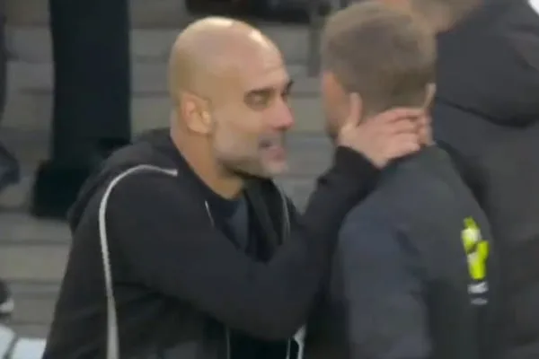 Dalam suasana pertandingan yang penuh emosi, Pep Guardiola terlihat berinteraksi intens dengan wasit keempat, Craig Pawson, di pinggir lapangan. Setelah dimarahi, momen aneh terjadi. Pelatih berkepala plontos yang semula terlihat tegang tiba-tiba tertawa, kemudian meraih kepala wasit, dan mencoba menciumnya.
