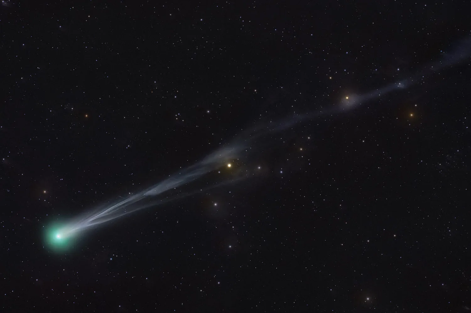 Astrofotografer Julien DeWinterseorang dosen junior di Universitas Mons di Belgia, memotret Komet Lemmon pada akhir September dari Texas, menangkap cahaya zamrud yang dramatis dan ekornya yang panjang.