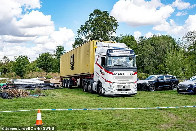 Sebuah truk Volvo putih, yang dimiliki oleh Martello Transport yang berbasis di Kent, telah ditinggalkan, sementara tumpukan kotak dan bingkai logam yang dibongkar terletak di atas rumput.