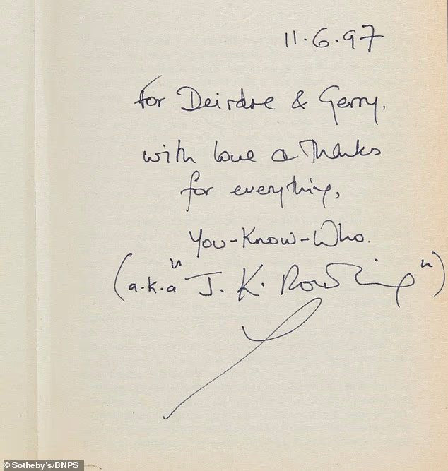 Edisi pertama Harry Potter yang langka yang dituliskan JK Rowling kepada seorang teman telah dijual dengan harga ₤ 150 000 Dia dengan lucu menyebut dirinya sebagai ‘You Know Who’ sebagai anggukan kepada penjahatnya Lord Voldemort sebelum menulis namanya sendiri