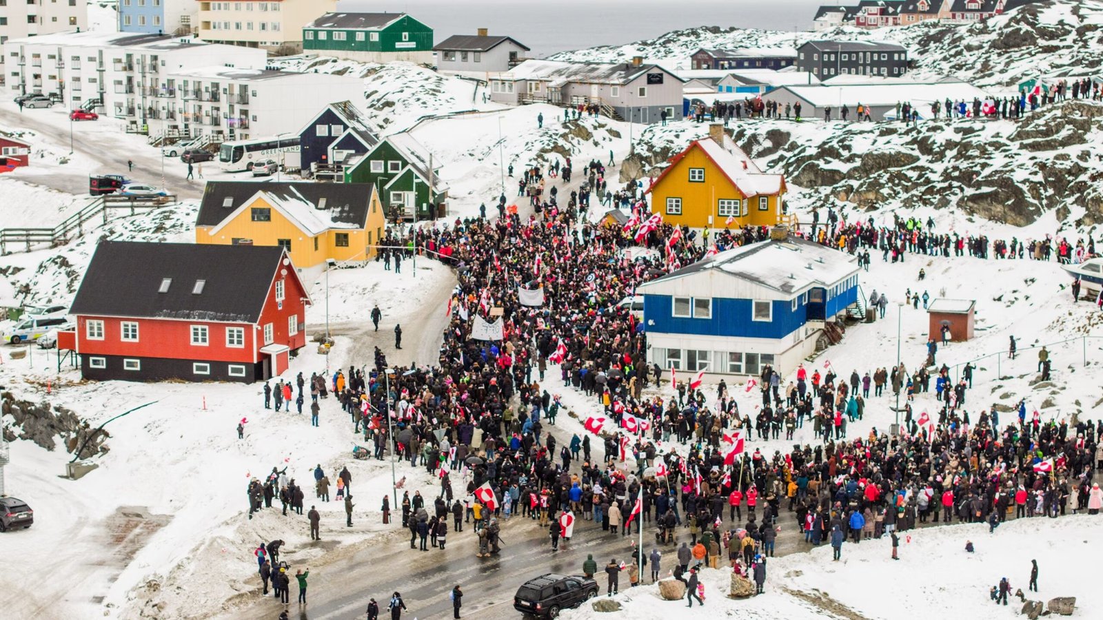 Pemandangan dari udara ini menunjukkan orang-orang saat mereka mengambil bagian dalam demonstrasi yang mengumpulkan hampir sepertiga penduduk kota untuk memprotes rencana Presiden AS untuk merebut Greenland, 17 Januari 2026, di Nuuk, Greenland.