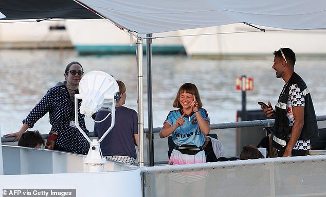 Thunberg terlihat memotret saat dia menunggu untuk berangkat di atas kapal dengan sesama juru kampanye