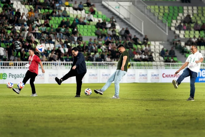 Keterangan Foto: Gubernur Sumatera Utara (Sumut) Bobby Nasution bersama Ketua Umum PSSI Erick Thohir menendang bola pertanda dimulainya Pegadaian Champion musim 2025/ 2026 di Stadion Utama Sumatra Utara, Jumat (12/ 09/2025 Pada pertandingan perdana ini PSMS Medan harus takluk oleh Persekat Tegal dengan skor tipis 0- 1 yang tercipta di akhir babak Ke- 2