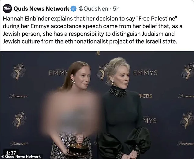 Quds News Network, publikasi Hamas, memuji aktris Hannah Einbinder karena mengatakan ‘Palestina Gratis’ selama pidatonya di Emmy di samping gambarnya dengan dada yang kabur