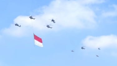 Momen 8 Helikopter TNI Kibarkan Bendera Merah Putih Raksasa di Atas Istana