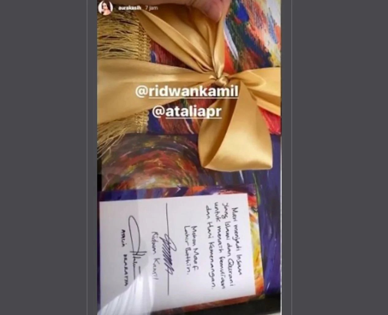 Tak berhenti di situ, Ridwan Kamil juga sempat menjelaskan secara langsung kepada Aura Kasih mengenai latar belakang hadiah tersebut. Ia mengungkapkan bahwa sajadah dan sampul Alquran itu berangkat dari kegemarannya melukis.