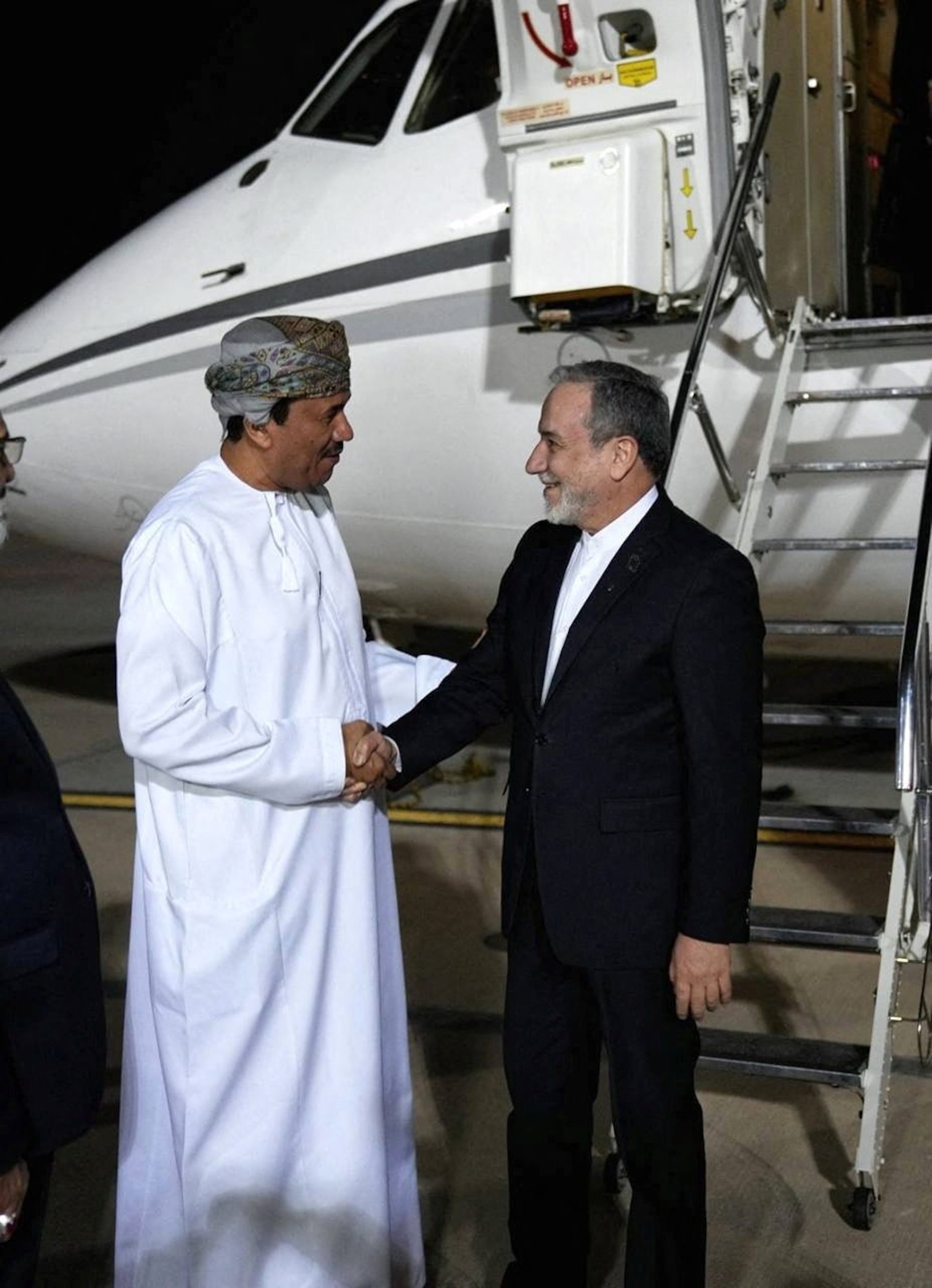 Menteri Luar Negeri Iran Abbas Araghchi disambut oleh seorang pejabat Oman setibanya di Muscat, Oman, dalam gambar selebaran yang diperoleh pada 6 Februari 2026