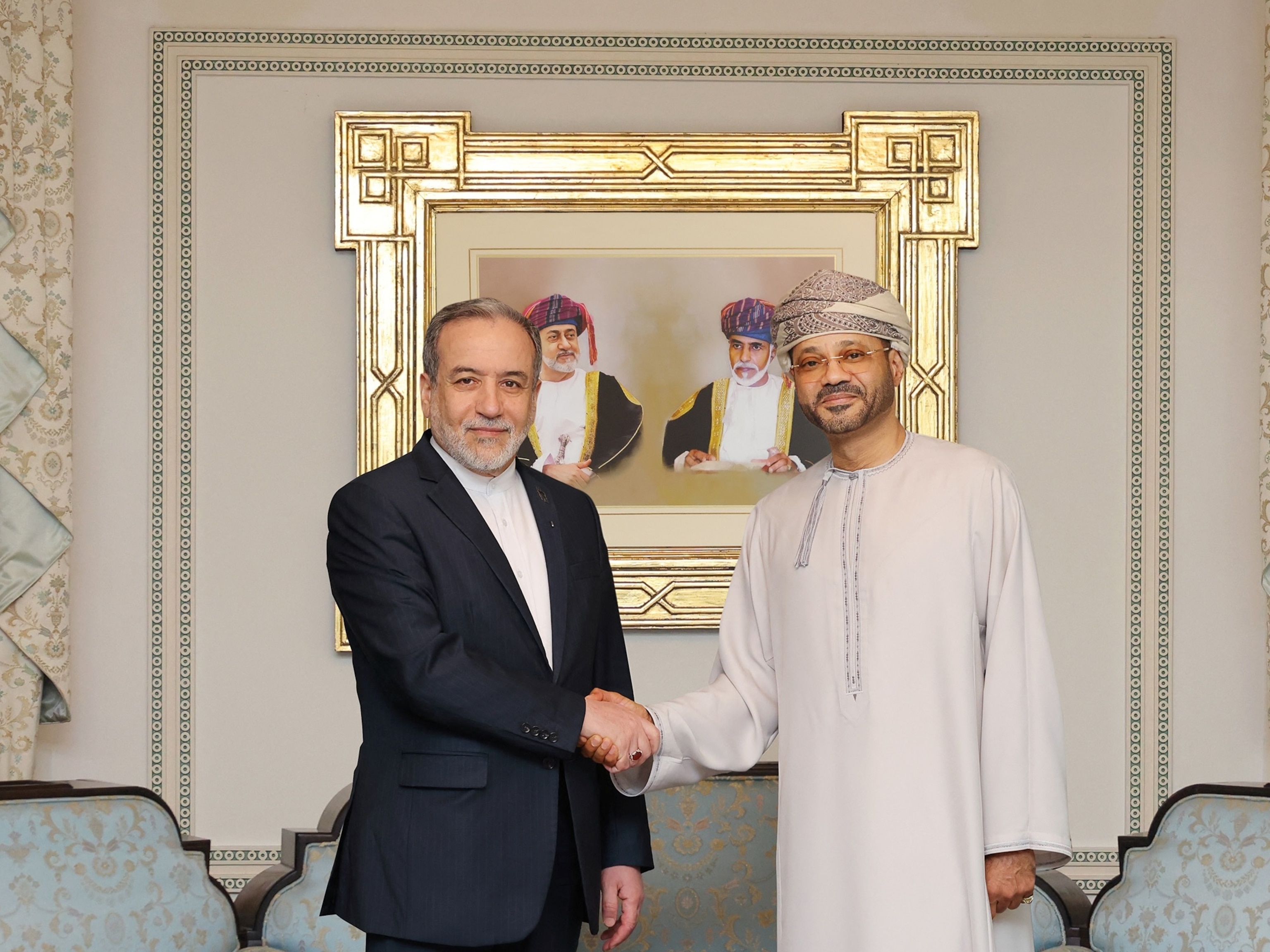 Foto selebaran dari Kementerian Luar Negeri Oman yang dirilis pada 6 Februari 2026 ini menunjukkan Menteri Luar Negeri Iran Abbas Araghchi (kiri) berjabat tangan dengan Menteri Luar Negeri Oman Badr container Hamad al-Busaidi, di Muscat pada 6 Februari 2026