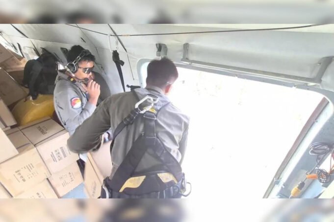 penyaluran menggunakan helikopter karena sejumlah jalur darat terputus dan distribusi logistik yang terbatas di beberapa wilayah terdampak.