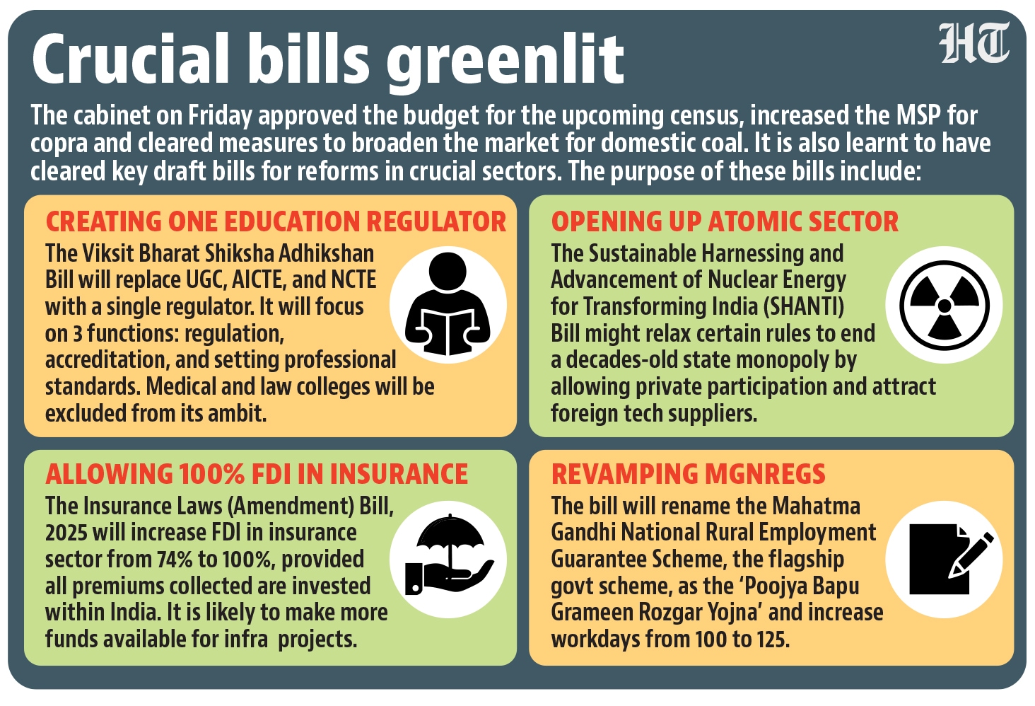 Kabinet Uni pada hari Jumat menyetujui anggaran untuk sensus mendatang dan kemitraan ekonomi baru dengan Oman, mengizinkan ekspor batu bara, dan menyetujui rancangan undang-undang penting yang mengusulkan regulatory authority pendidikan nasional yang bersatu, membuka sektor asuransi sepenuhnya bagi investasi asing langsung, membawa perubahan besar pada sektor energi atom untuk menarik pemain swasta, dan mengganti nama skema pekerjaan pedesaan nasional, kata orang-orang yang mengetahui perkembangan tersebut pada hari Jumat.