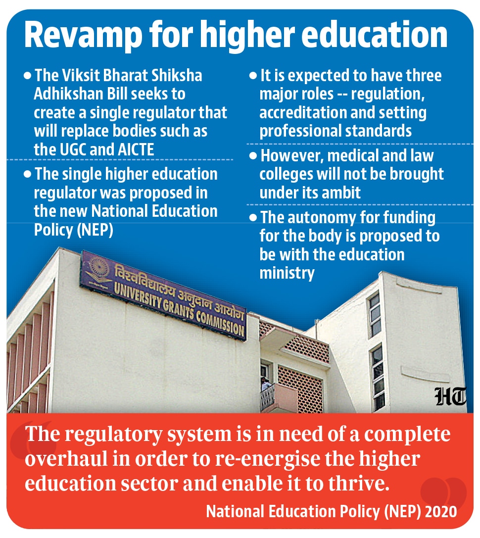 Saat ini, UGC mengatur pendidikan tinggi non-teknis, AICTE mengawasi pendidikan teknis dan NCTE adalah badan pengatur pendidikan guru. Regulator pendidikan tunggal yang diusulkan akan bertindak sebagai regulator pendidikan tinggi tunggal, tidak termasuk perguruan tinggi kedokteran dan hukum. Ini akan fokus pada tiga fungsi inti: regulasi, akreditasi, dan penetapan standar profesional. Pendanaan, yang dianggap sebagai vertikal terpisah, akan tetap berada di bawah kementerian pendidikan dan bukan regulator.