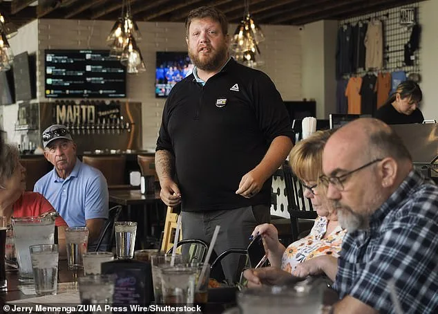Nathan Sage melakukan pertemuan dan sapa dengan pemilih dan pendukung potensial di Marto Brewery di pusat kota Sioux City, Iowa Minggu, 24 Agustus 2025