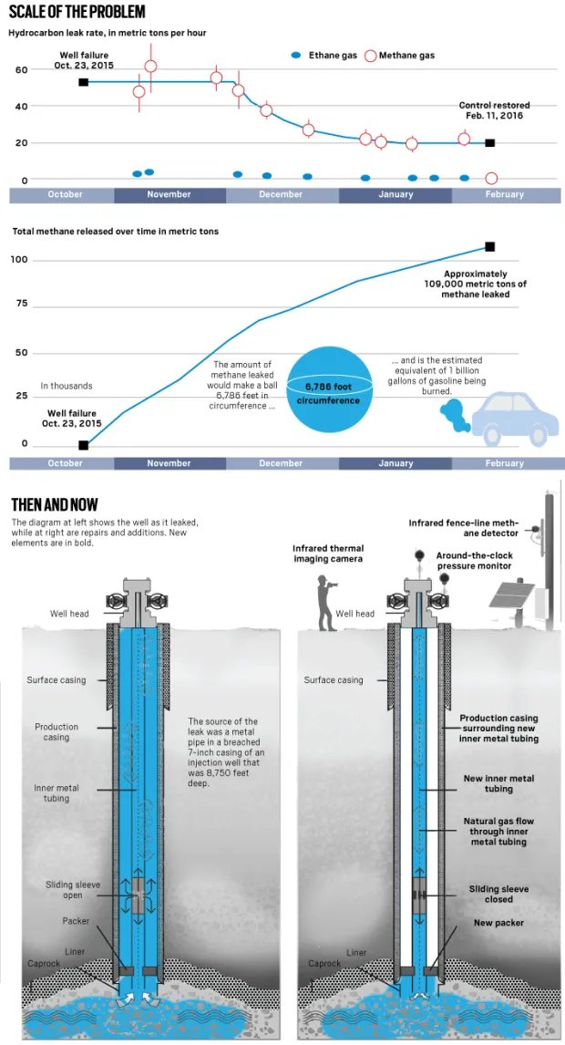 Sumur yang bocor merupakan satu dari 115 sumur yang terhubung dengan reservoir penyimpanan bawah permukaan di ladang gas Aliso Canyon. Ladang tersebut telah digunakan untuk penyimpanan gas alam sejak tahun 1973 dan merupakan fasilitas terbesar kedua di AS, yang mampu menampung hingga 86 miliar kaki kubik.
