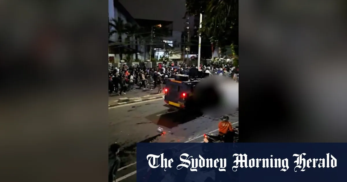 Kendaraan polisi menghancurkan pria selama protes Jakarta