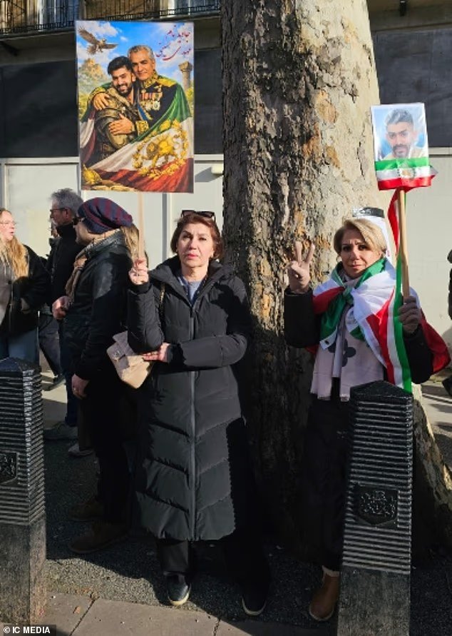 Farah dan anggota keluarga lainnya, Parvaneh, mengangkat poster yang menunjukkan gambar Hosseini dan Pehlavi, yang hari ini mengatakan sudah waktunya untuk mengakhiri republik Islam.