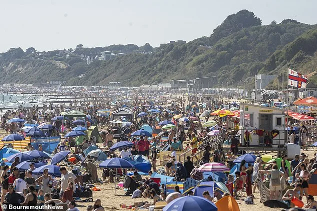 Pasir itu nyaris tidak terlihat di bawah jumlah mayat dan payung yang telah ditopang di Bournemouth, ketika gelombang menyapu untuk menjaga pengunjung pantai tetap dingin dengan suhu yang memuncak sekitar 25 C.