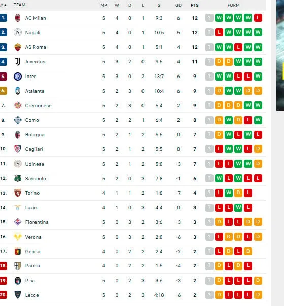 Selanjutnya posisi keempat klasemen sementara Liga Italia ditempati oleh Juventus dengan 11 poin dari lima pertandingan, sedangkan peringkat kelima dihuni Inter Milan dengan sembilan poin.