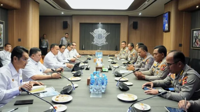 Jakarta, Viva — Kepala Korps Lalu Lintas (Kakorlantas) Polri Irjen Agus Suryonugroho melaksanakan rapat koordinasi bersama Direktur Jenderal Perhubungan Darat Aan Suhanan untuk kolaborasi dan koordinasi mengatasi Lebih Dimensi dan Kelebihan beban serta Hari Keselamatan Lalu Lintas dan Angkutan Jalan Nasional, di NTMC Polri, Selasa 26 Agustus 2025