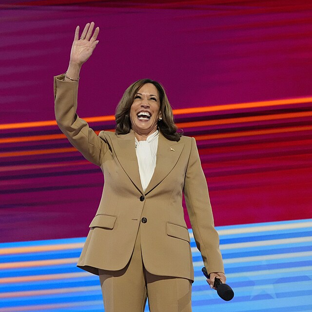 Kamala Harris dengan setelan celana biru di Konvensi Nasional Partai Demokrat 2024.