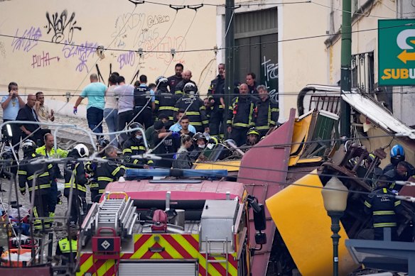 Tim darurat bekerja di lokasi trem listrik yang tergelincir di Lisbon pada hari Rabu. Kredit: Ap