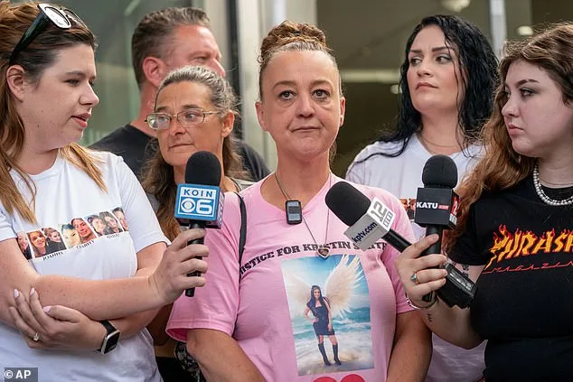 Ibu Kristin Smith, Melissa Smith (dalam warna merah muda di luar Gedung Pengadilan Multnomah County di Portland pada 5 Agustus 2025 setelah Jesse Calhoun didakwa atas pembunuhan) mengatakan para pejabat Portland berutang permintaan maaf kepada keluarga itu dengan sebuah permintaan maaf kepada keluarga itu kepada keluarga itu