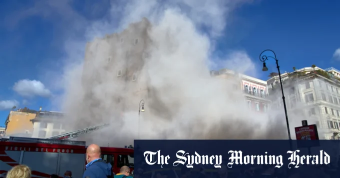 Ratusan wisatawan berkumpul untuk menyaksikan petugas pemadam kebakaran menggunakan tangga bergerak untuk membawa tandu ke tingkat atas Torre dei Conti selama upaya penyelamatan pertama. Tiba-tiba, bagian lain dari bangunan itu runtuh sebagian, menimbulkan awan puing dan memaksa petugas pemadam kebakaran segera turun ke tangga.