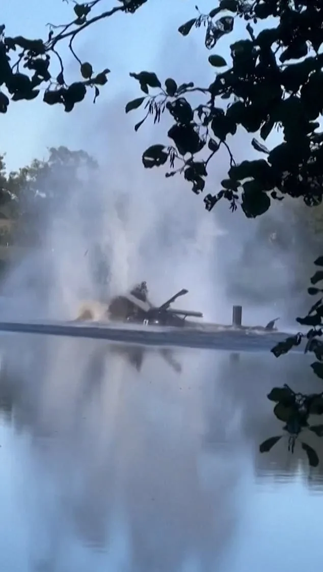 Pesawat itu jatuh ke sisinya ke kolam dan membuat percikan besar