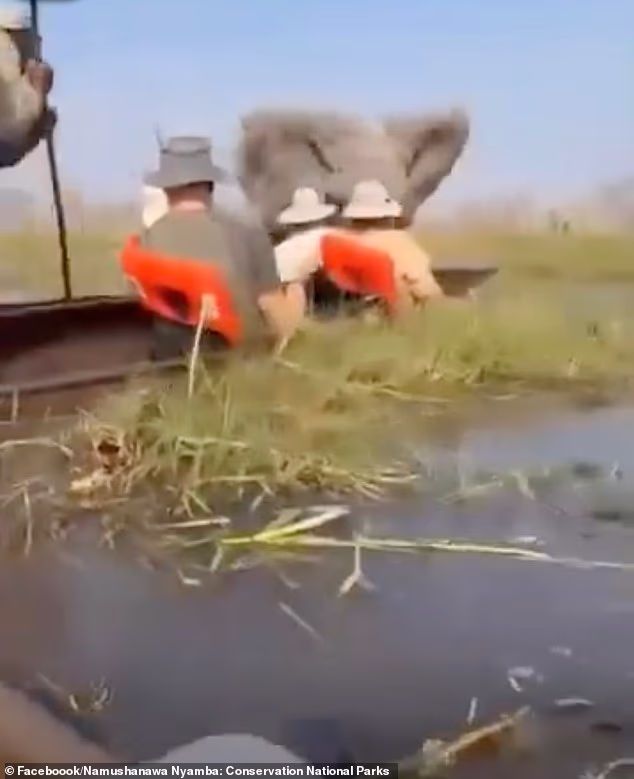 Ini adalah momen menakutkan dua pasangan dari Inggris dan AS menipu kematian ketika gajah yang mengamuk membalik sampan safari mereka dan memukul salah satu wanita dengan batangnya.