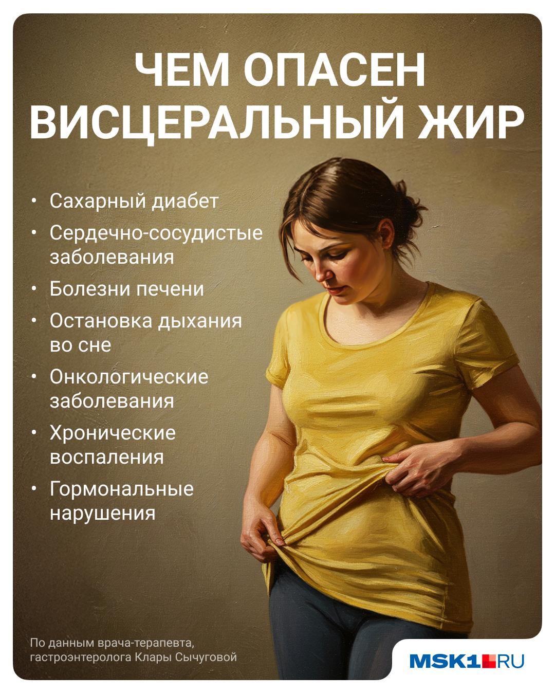 “Lemak visceral membedakan zat yang memancing proses peradangan dan melanggar pekerjaan sistem hormonal,” tambah Dokter Elena Pavlova.