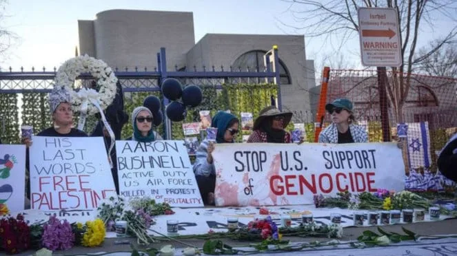 Demonstran berkumpul saat berjaga di luar Kedutaan Besar Israel