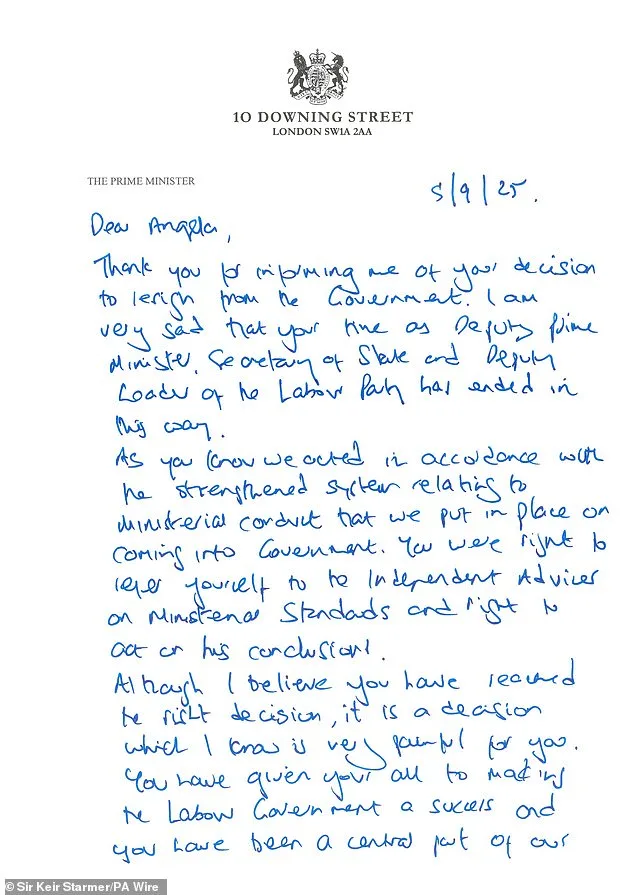 Alih -alih mengirim surat yang diketik yang biasa ke menteri yang mengundurkan diri, Sir Keir Starmer memilih pena air mancurnya kemarin untuk mengucapkan selamat tinggal kepada Angela Rayner.