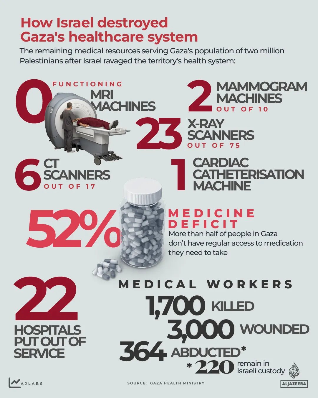 Sistem layanan kesehatan di Gaza telah hancur akibat perang genosida yang dilakukan Israel di wilayah tersebut, dengan 22 rumah sakit tidak berfungsi dan 1.700 pekerja medis terbunuh, menurut Kementerian Kesehatan Palestina.